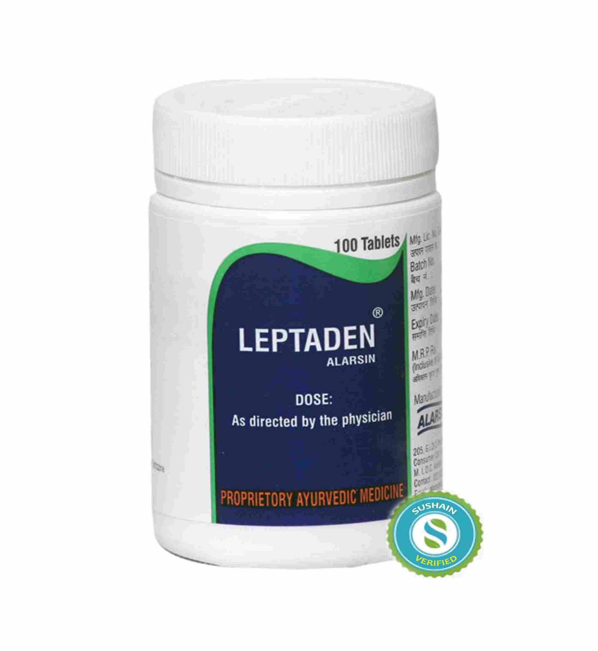 Leptaden Tablets: Shatavari (Asparagus racemosus), Lodhra (Symplocos racemosa), Gokshura (Tribulus terrestris), and more. Safe to consume on the recommendation of a qualified Ayurvedic practitioner.
