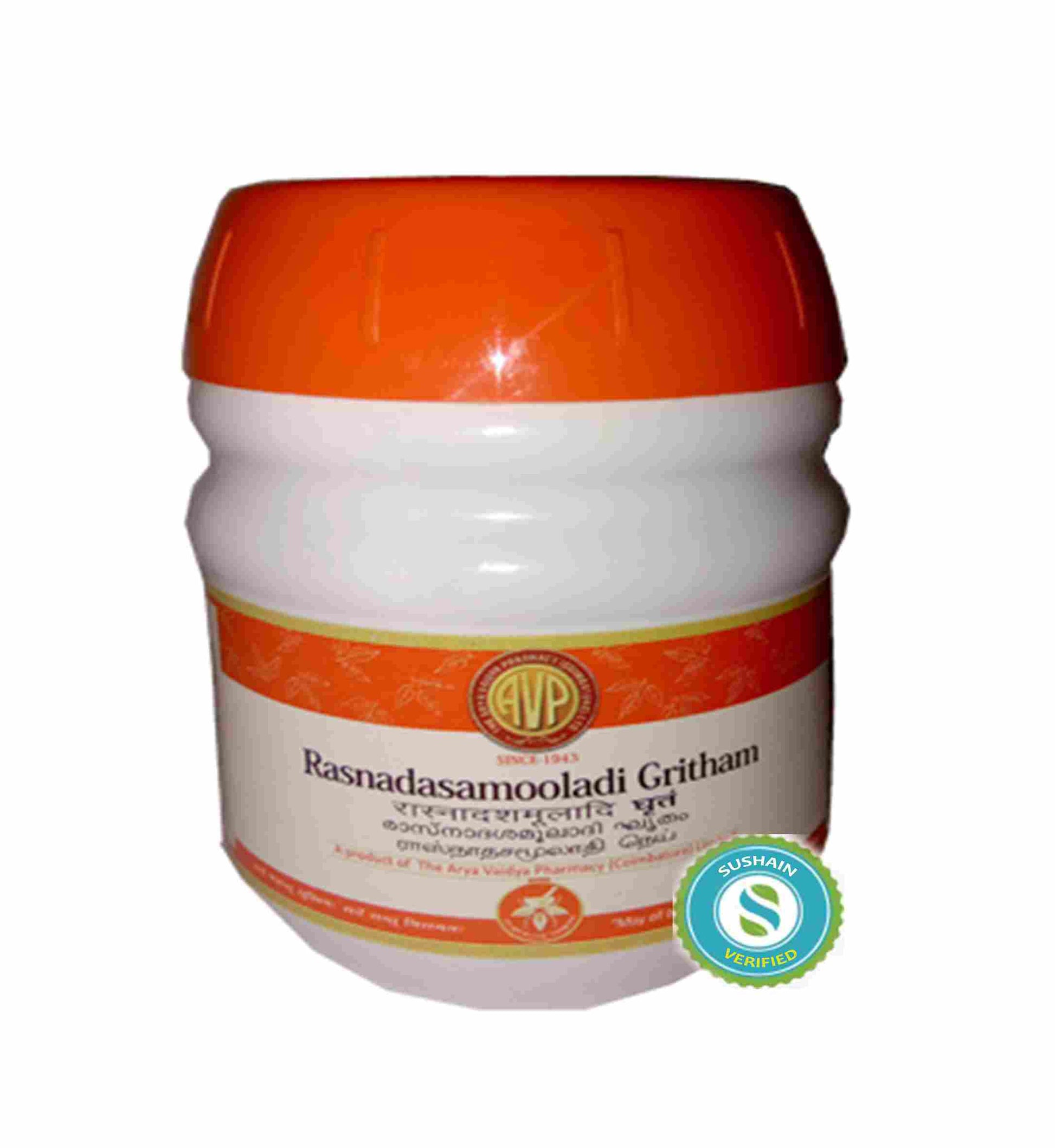 Rasnadasamooladi Gritham AVP - Ayurvedic ghee preparation for promoting joint health and maintaining flexibility, containing Rasnadi Choornam and herbal ingredients.