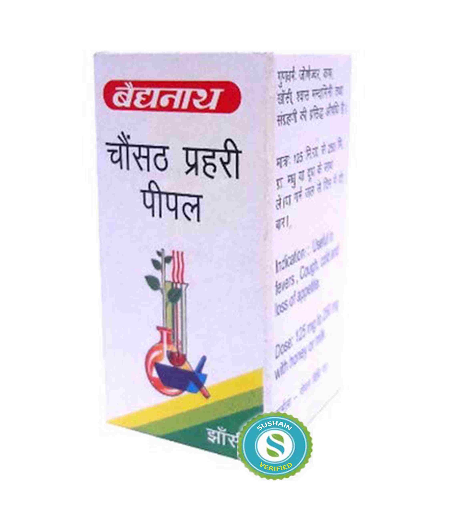 Baidyanath Chausath Prahari Pipal: Ayurvedic herbal formulation with ingredients like Pipal and Ajwain, used for digestive support and maintaining gastrointestinal health.
