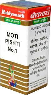 Baidyanath Moti Pishti No.1 is an ayurvedic medicine that is prepared from calcium and used to treat digestive, cardiac and psychological problems. It has antacid, anti-inflammatory, antidepressant and muscle relaxant properties.