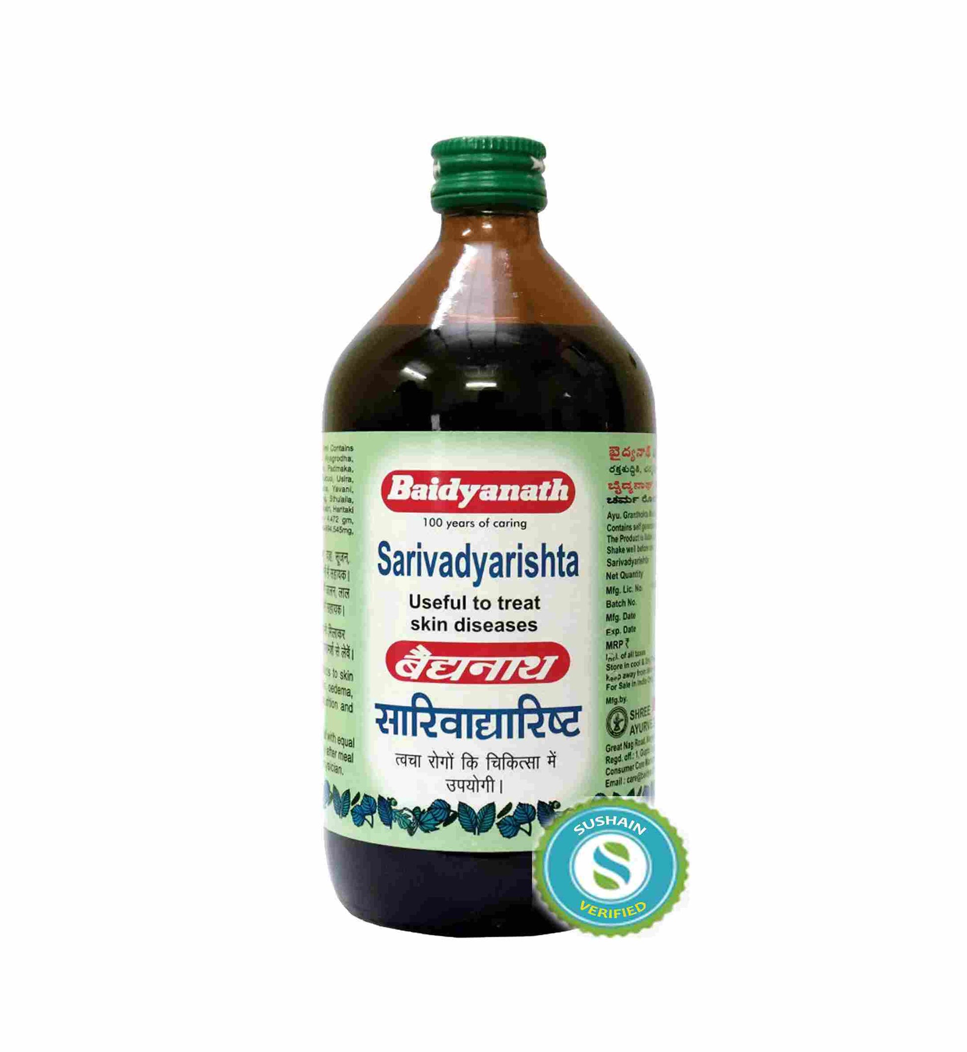 Sarivadyarishta 450 Ml Baidyanath: Ayurvedic herbal tonic to promote overall wellness and liver health.