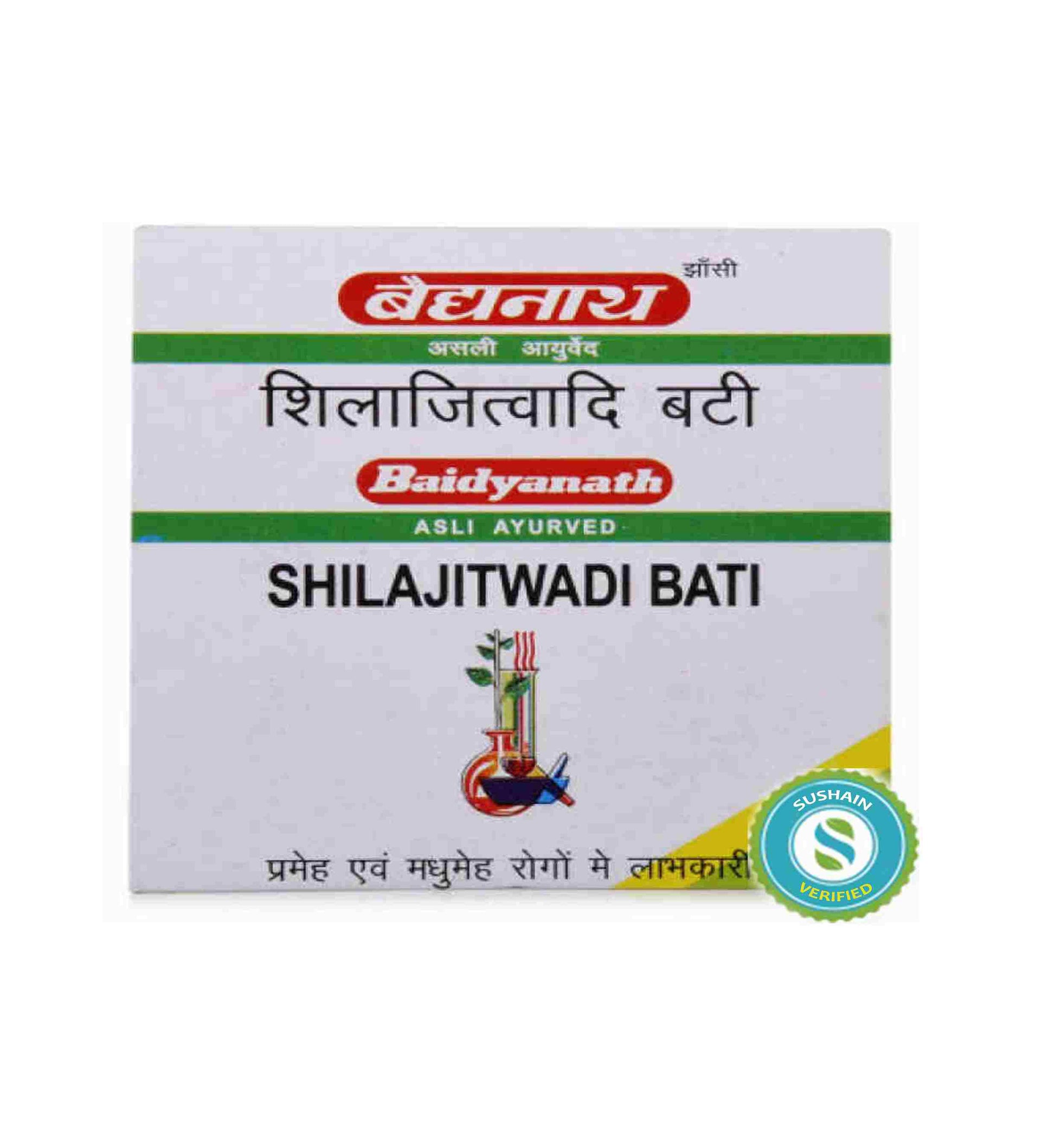 Shilajitwadi Bati Baidyanath: Ayurvedic tablets containing Shilajit and other ingredients, used for rejuvenation and overall well-being.