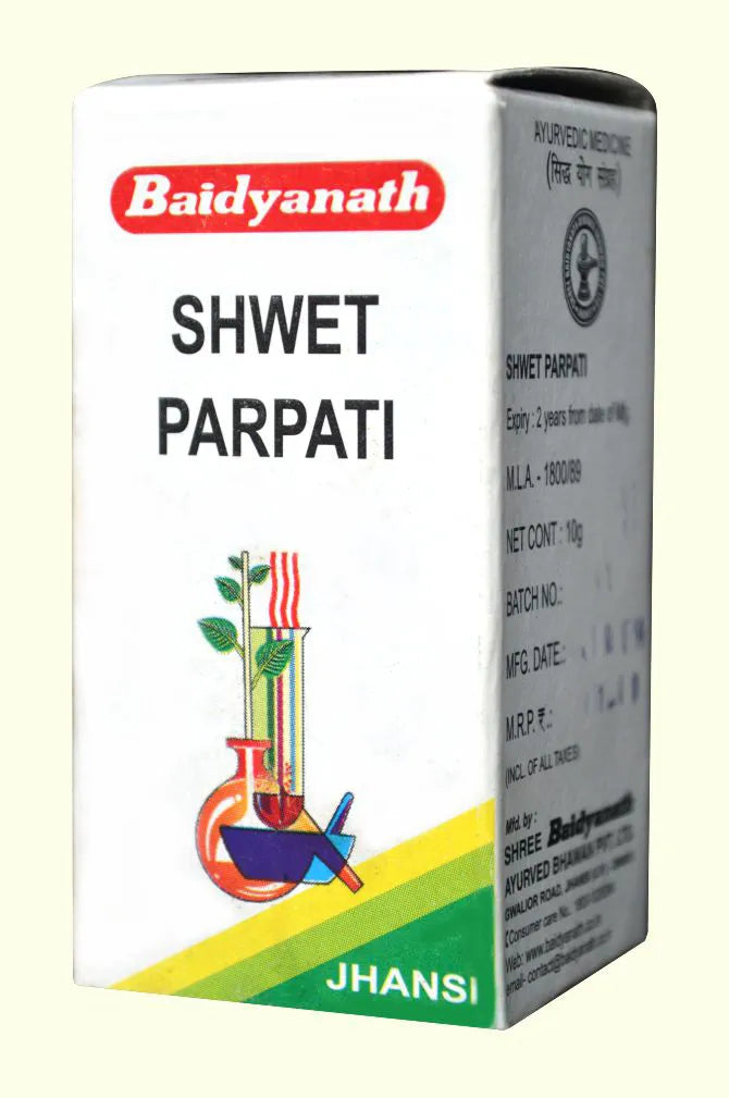 Shwet Parpati or Kshara parpati is Ayurvedic preparation made by dehydrated homogenous blending of ammonium chloride, potash alum and potassium nitrate. This medicine is useful in treating dysuria, oliguria, colic, urinary tract infections, urinary calculi and hyperacidity. Shwet Parpati is white in colour and is not prepared from black sulphide of mercury. This preparation is called Parpati as it is made in the form of thin flakes. This form of medicine is more beneficial compared to metallic Bhasma.