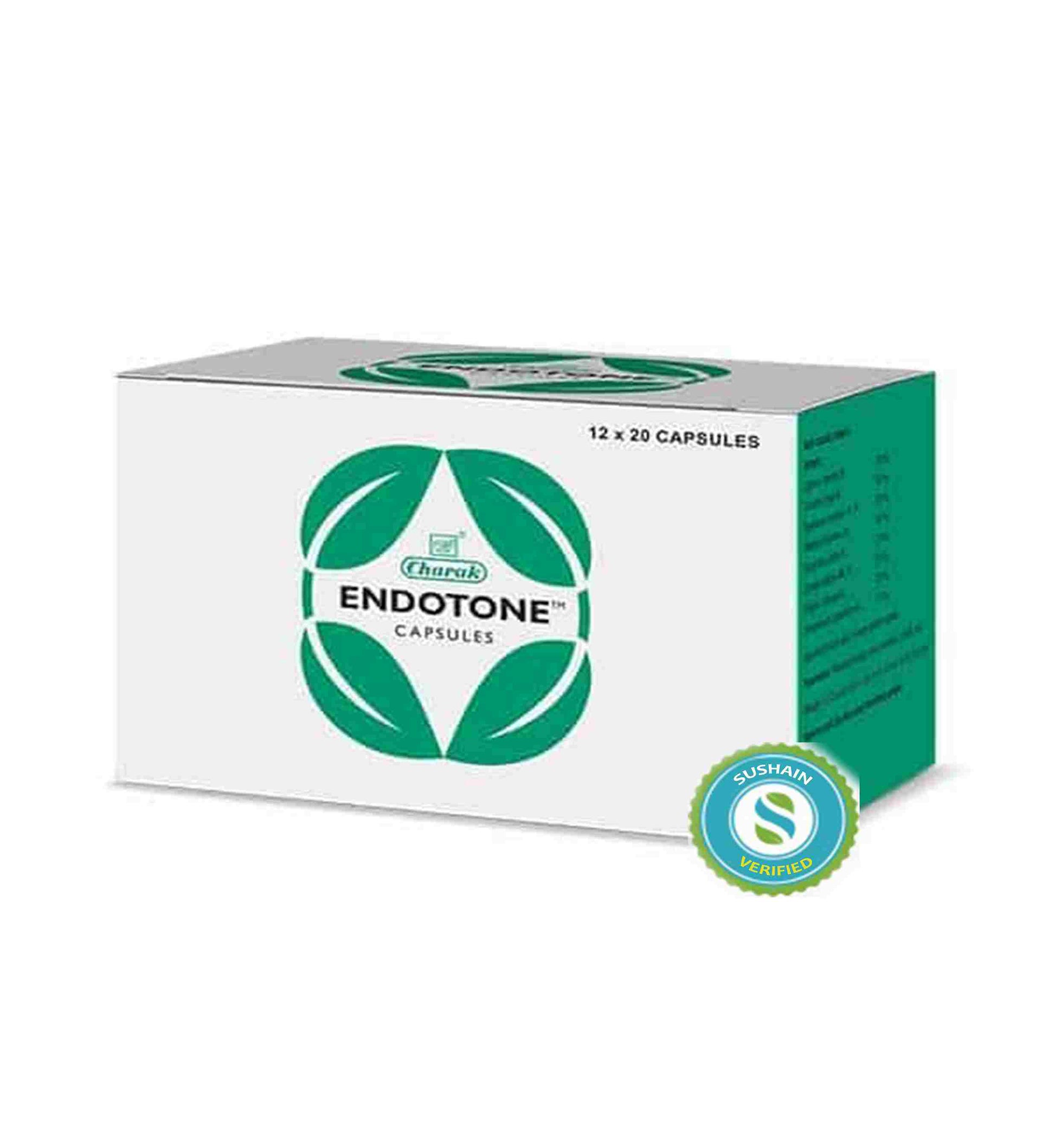 Endotone Capsule by Charak: Ayurvedic capsules containing herbs like Ashoka (Saraca indica) and Lodhra (Symplocos racemosa), used to support women's reproductive health, maintain hormonal balance, and promote overall well-being.