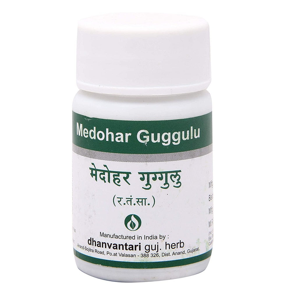 Medohar Guggulu Tablet contains Santhi, Kali Mirch, Pipal, Chitrakmool, Nagarmotha, Vavidang, Guggulu, and Erand tail as main active ingredients. Medohar Guggulu Tablet burns body fat, improves digestive functions, and is effective in rheumatic & respiratory disorders.