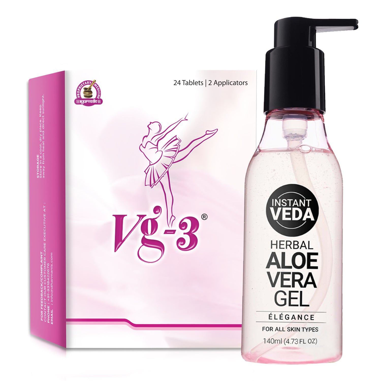 VG3 Tablets & 99% Pure Aloe Vera Gel – Intimate Hygiene & Natural Skincare Combo Support your daily self-care routine with the VG3 Tablets and 99% Pure Aloe Vera Face Gel Combo Pack—designed for women who value both intimate wellness and gentle skincare. This pack includes 24 VG3 Tablets, made with natural ingredients to help maintain freshness and support a healthy balance as part of your intimate hygiene routine. Paired with 140 ml of Aloevera Gel, it delivers soothing hydration and nourishment for the skin—ideal for calming, moisturizing, and revitalizing without harsh chemicals. Perfect for everyday use, this combo promotes all-day comfort, freshness, and a naturally radiant appearance—inside and out.Description
