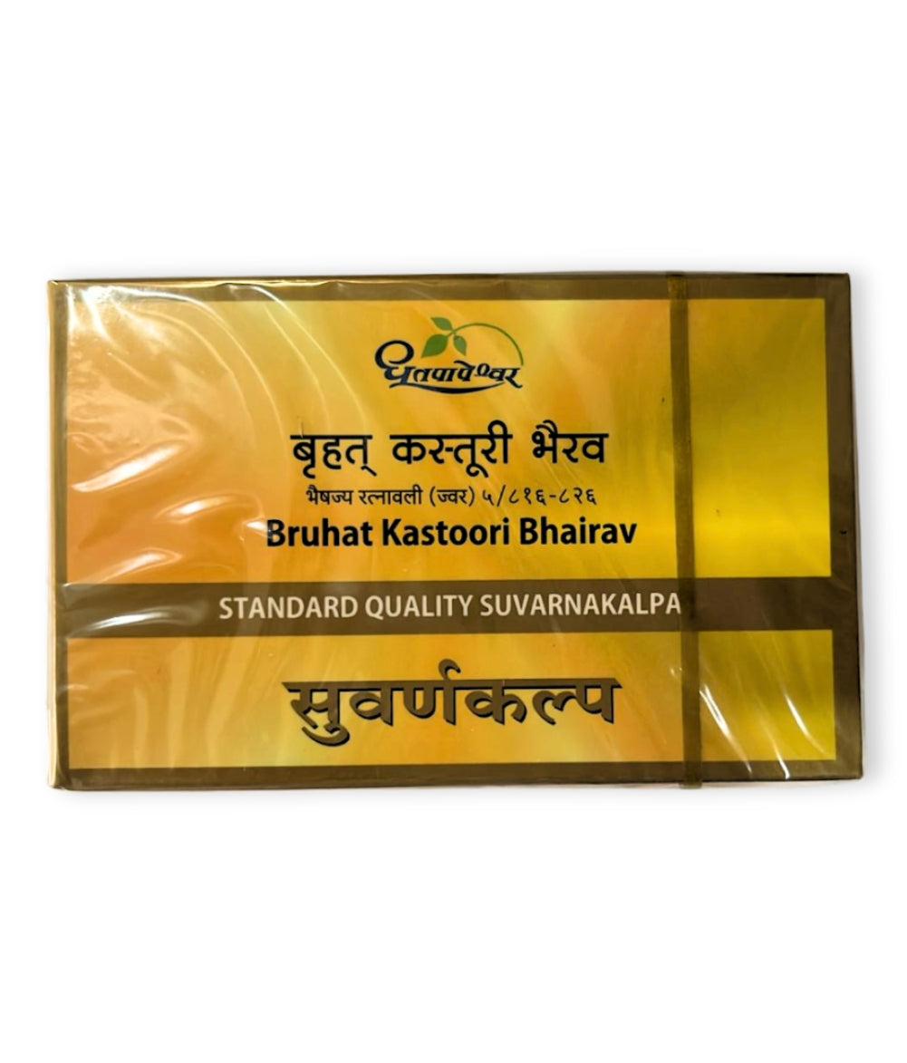 Kastoori Bhairav Ras is an Ayurvedic medicine in tablet form. It is used in the treatment of chronic fever. The Suvarnakalpa especially effective in various types of Jwara as well as Sannipatik and Vishamjwara