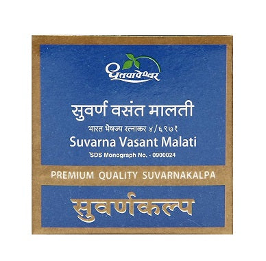 Suvarna Vasant Malati Suvarnakalpa Standard Quality By Dhootapapeshwar - Overall well-being supported by Suvarna (Gold Bhasma), Vasant (herb blend), Malati (Jasmine flower extract), and other ingredients.