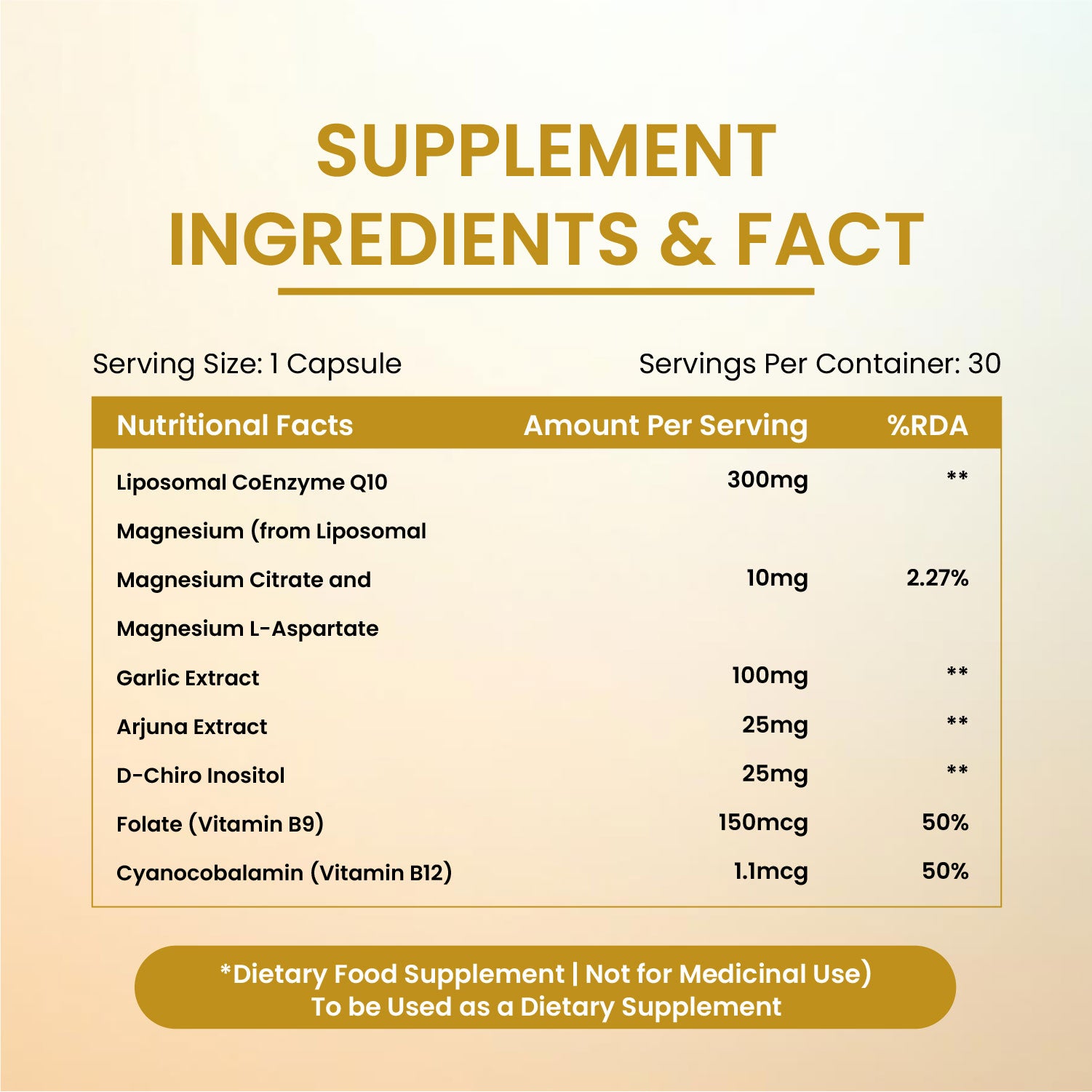 Himalayan Organics Liposomal Coenzyme Q10 | CoQ10 Supplement 300mg+ with Magnesium, Vitamin B9 & B12 Arjuna and Garlic Capsules