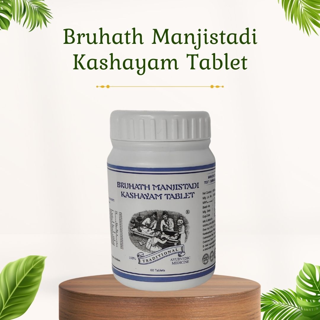 Bruhath Manjishtadi Kashayam Tablet is a potent Ayurvedic formulation designed to address various skin conditions and promote overall health. This herbal medicine is particularly effective in treating skin diseases, gout, syphilis, and non-healing wounds. The key ingredients in this kashayam tablet work synergistically to detoxify the body, reduce inflammation, and enhance skin health.