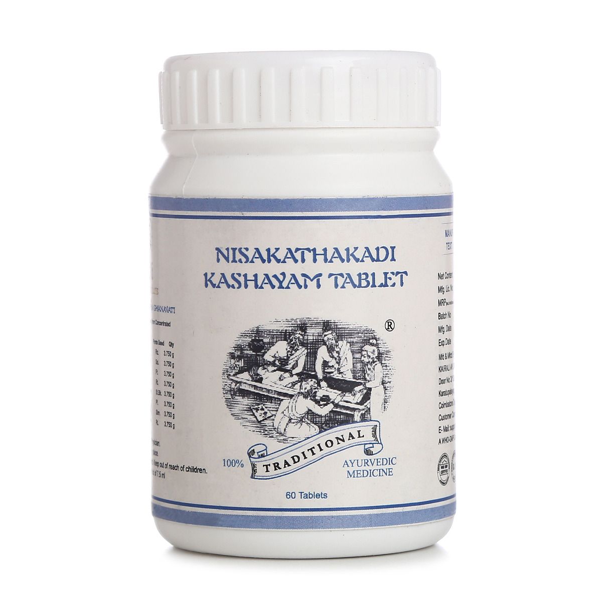 Nishakathakadi Kashayam Tablet (Gulika) helps in treating diabetes, pre-diabetes symptoms, and diabetes complications like neuropathy, nephropathy, retinopathy and diabetic carbuncles. It helps to control high blood sugar levels, blood pressure, obesity and insulin resistance.