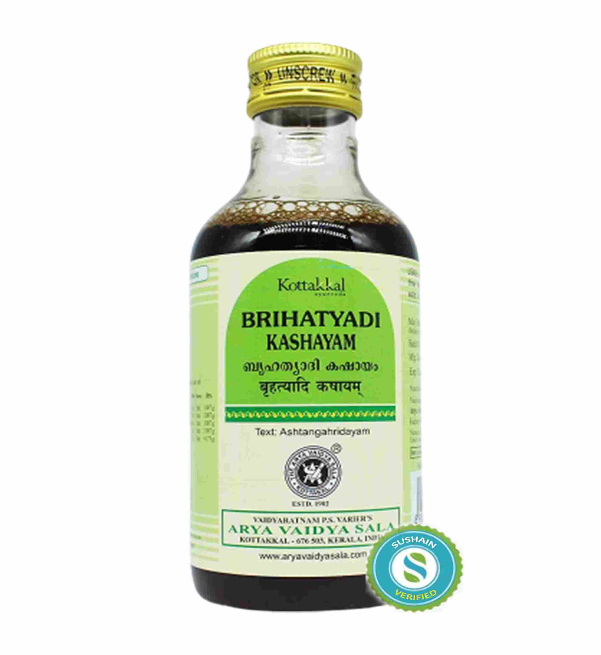 Brihatyadi Kashayam: Ayurvedic liquid formulation containing herbs like Brihati (Solanum indicum) and Kantakari (Solanum xanthocarpum), used to support respiratory health, relieve congestion, and promote healthy breathing.