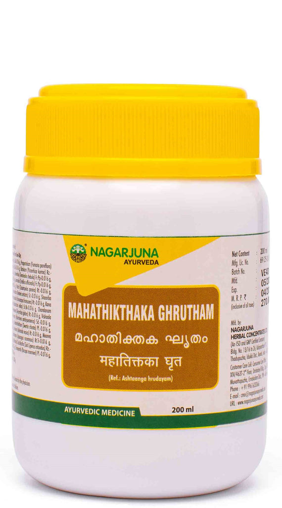 Mahaathikthaka ghrutham is known for its skin-nourishing properties. It can be used topically to address various skin conditions like non-healing wounds, eczema, urticaria, itching, skin rashes, and allergic hives. The formulation supports liver function and detoxification, which helps maintain a healthy liver.