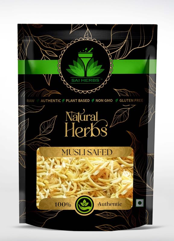Sai Herbs Musli Safed, derived from the roots of the Safed Musli plant (Chlorophytum borivilianum, Known for its adaptogenic properties, Safed Musli helps the body manage stress, increasing energy levels and reducing tiredness. It is renowned for boosting libido and managing love-making dysfunction. It can improve mental clarity and cognitive performance.
