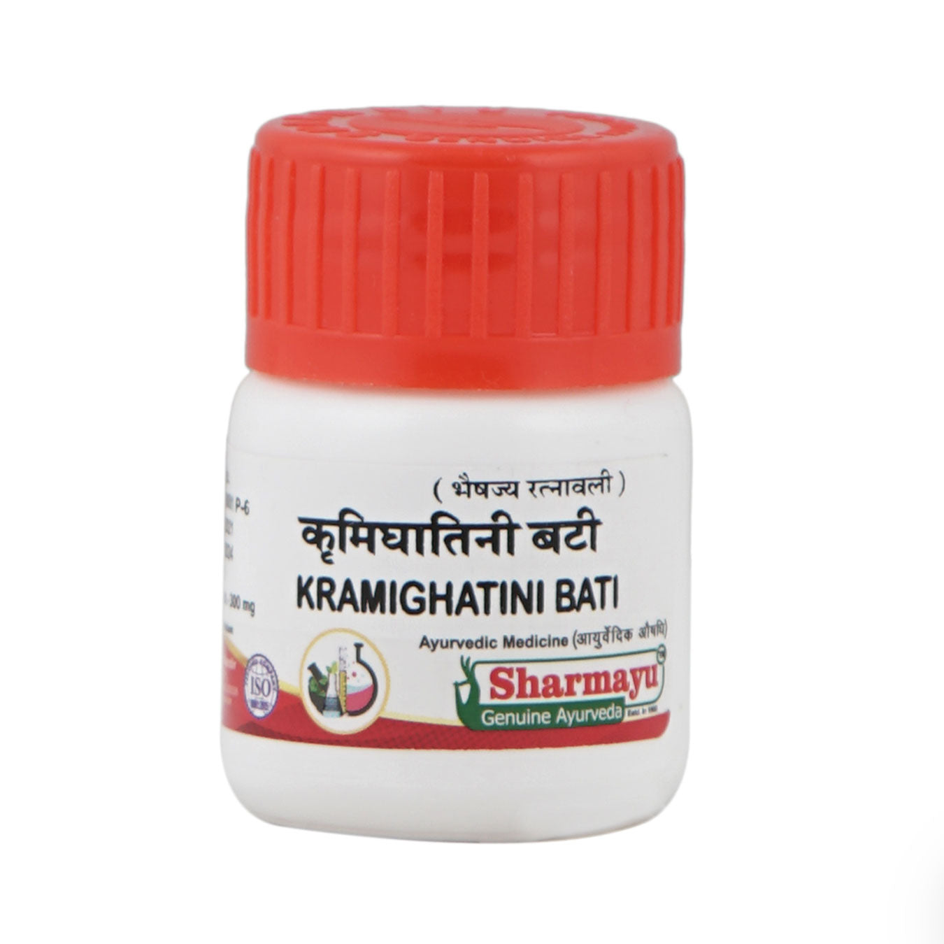 Sharmayu Krimi Ghatini Bati is an Ayurvedic medicine primarily used to treat worm infestations in both children and adults. It's also known to help with inflammatory conditions, nausea, colic pain, and excessive sneezing