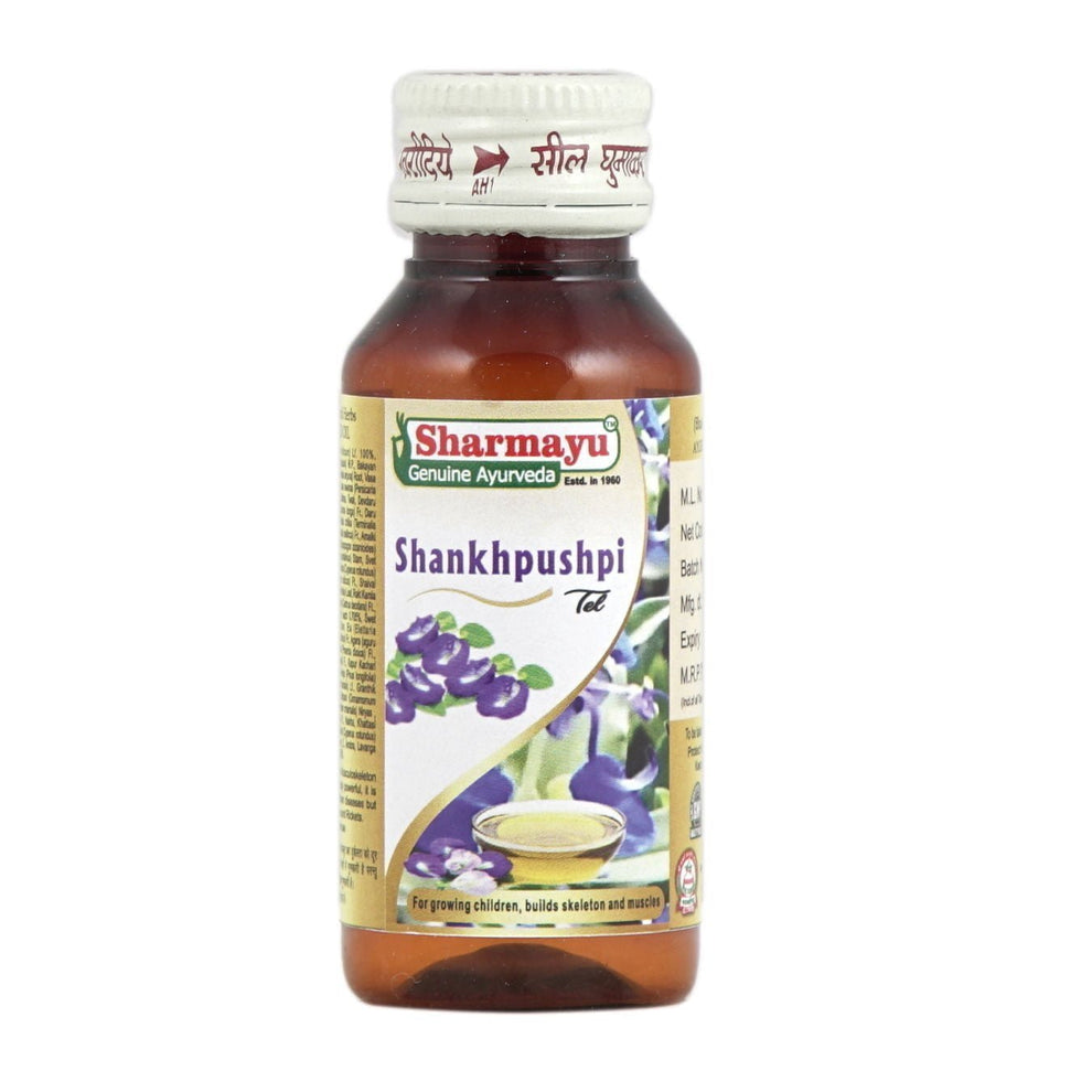 Sharmayu Shankhpushpi Tel, manufactured by Sharmayu Ayurveda, is an Ayurvedic oil that is believed to have benefits for brain health, memory, and concentration. It's also used to help with hysteria, nervousness, and blood pressure control