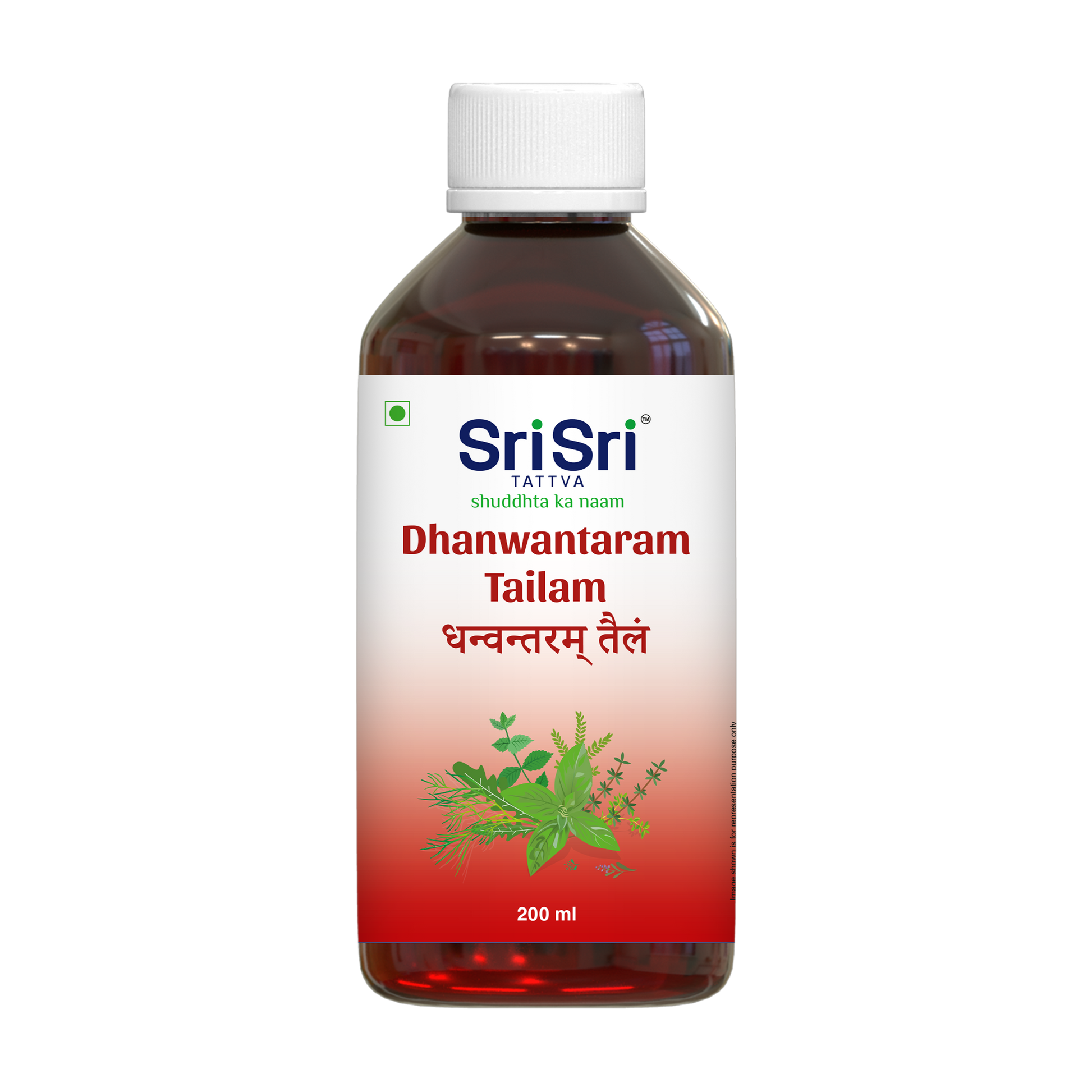 Dhanvantaram Tailam is an effective medicated oil that can be used both internally and externally. It helps in maintaining post-natal health in lactating women. Furthermore, it reduces muscular and skeletal pains and alleviates muscular debilities and emaciation. It promotes neurological health and restores mobility