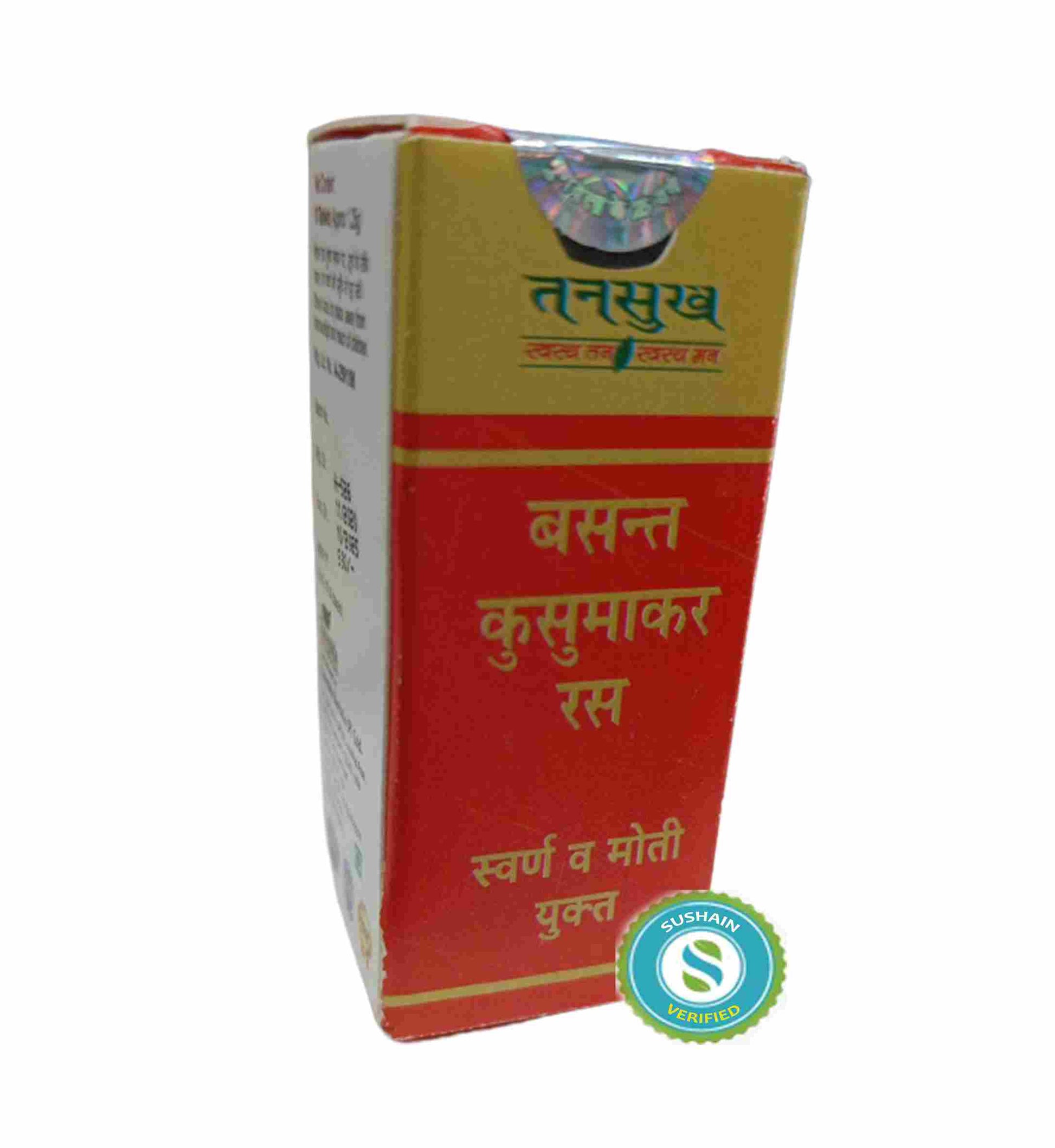 Vasant Kusumakar Rasa Swarn Moti Yukt by Tansukh: An Ayurvedic herbo-mineral formulation containing precious metals like gold and pearl. It is revered for its rejuvenating and aphrodisiac properties, promoting vitality and overall welbeing.