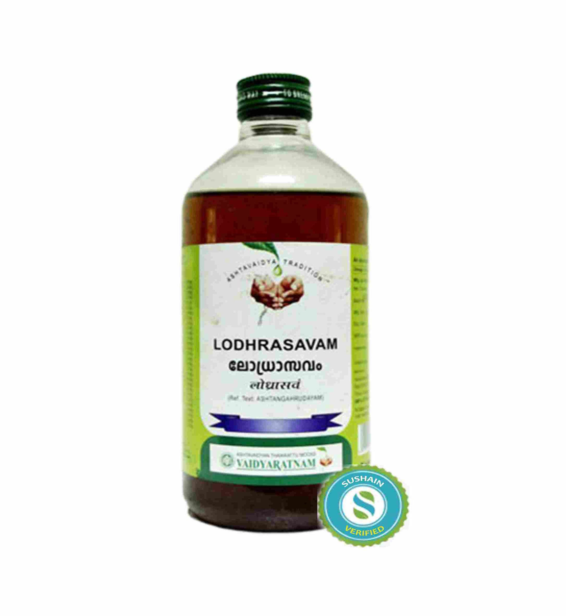 Lodhrasavam by Vaidyaratnam: An Ayurvedic herbal tonic containing Lodhra (Symplocos racemosa), Musta (Cyperus rotundus), and other ingredients, known for their astringent and cooling properties, supporting female reproductive health and maintaining menstrual balance.