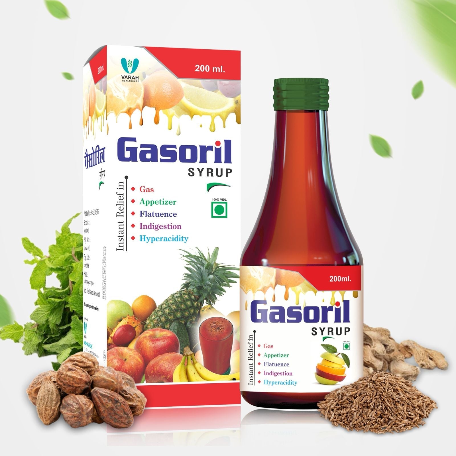 Ayurvedic Gasoril Syrup supports digestive health. Ingredients like ajwain and ginger improve digestion, reduce bloating, and relieve gas.