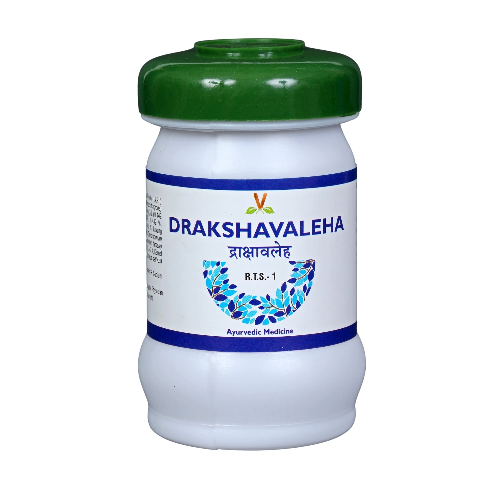 Drakshavaleha is an Ayurvedic medicine. In Ayurvedic medicines, Avaleha or Leha is a semi-solid preparation which is prepared with addition of jaggery, sugar, honey or sugar-candy and boiled with prescribed herb juice or decoction. They are also known as Modaka, Guda, Khanda, Rasayana, Leham etc. Drakshavaleha is mentioned in Astanga Hridaya Chikithsasthana for Pandu Roga. It is a well-known medicine for jaundice and anaemia. The main ingredient of this medicine is Draksha or Vitis vinifera. In some places of India, Drakshavaleha is also recommended by Ayurvedic physicians for pregnant woman as it is a Rasayana that deals with weakness, anaemia, digestive disorders, improves weight gain and liver function.Description