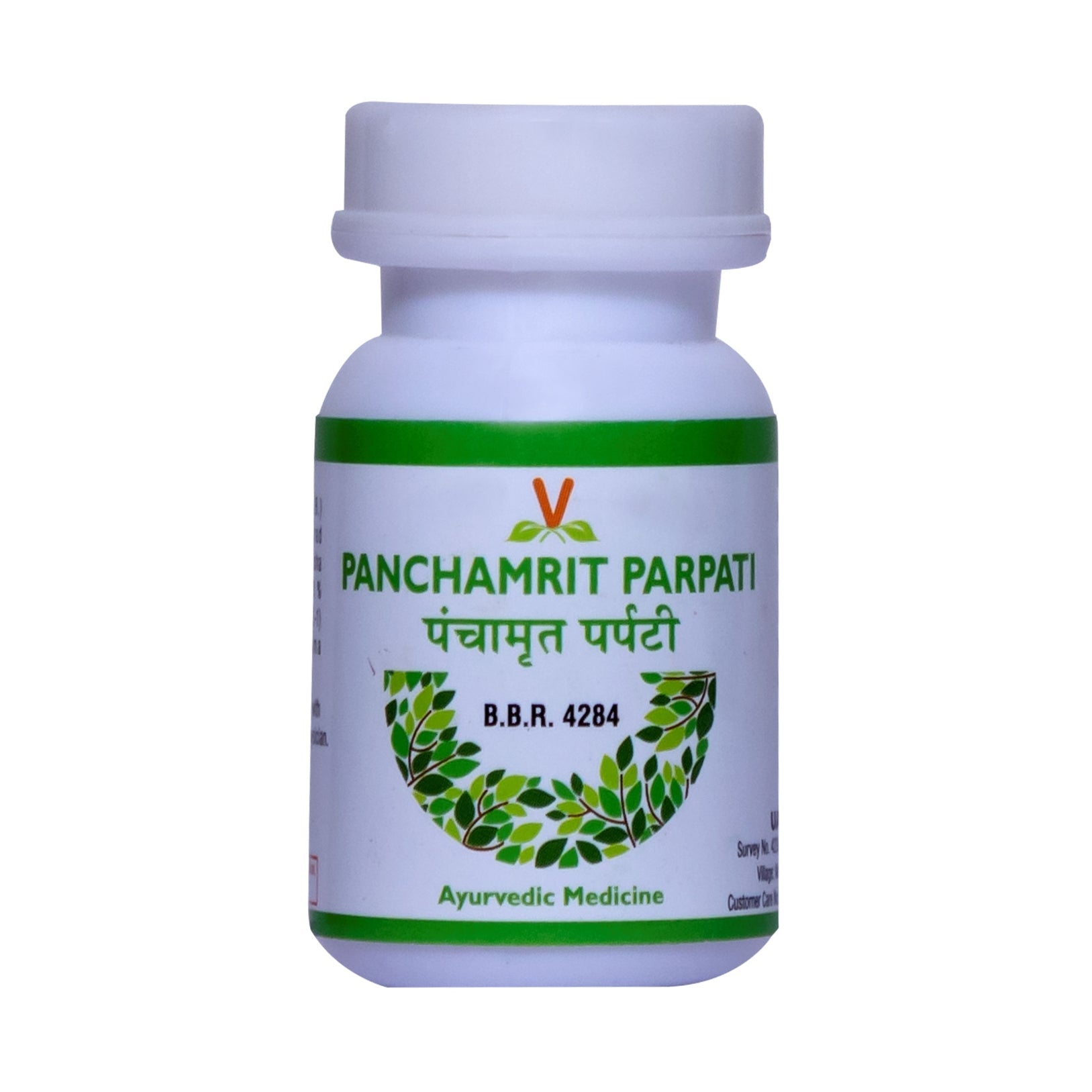 In Ayurveda term, Parpati (means brittle) implies a specific method of preparing medicinal formulations which disintegrates and gets absorbed in the small intestine region and not in the stomach. These medicines are used to treat grant-related problems and low appetite. Panchamrut Parpati is such medicine containing Parad and Gandhak mixture (mostly Kajjali or the black sulfide of mercury) along with Lauh, abhrak, and Tamra Bhasma.Description