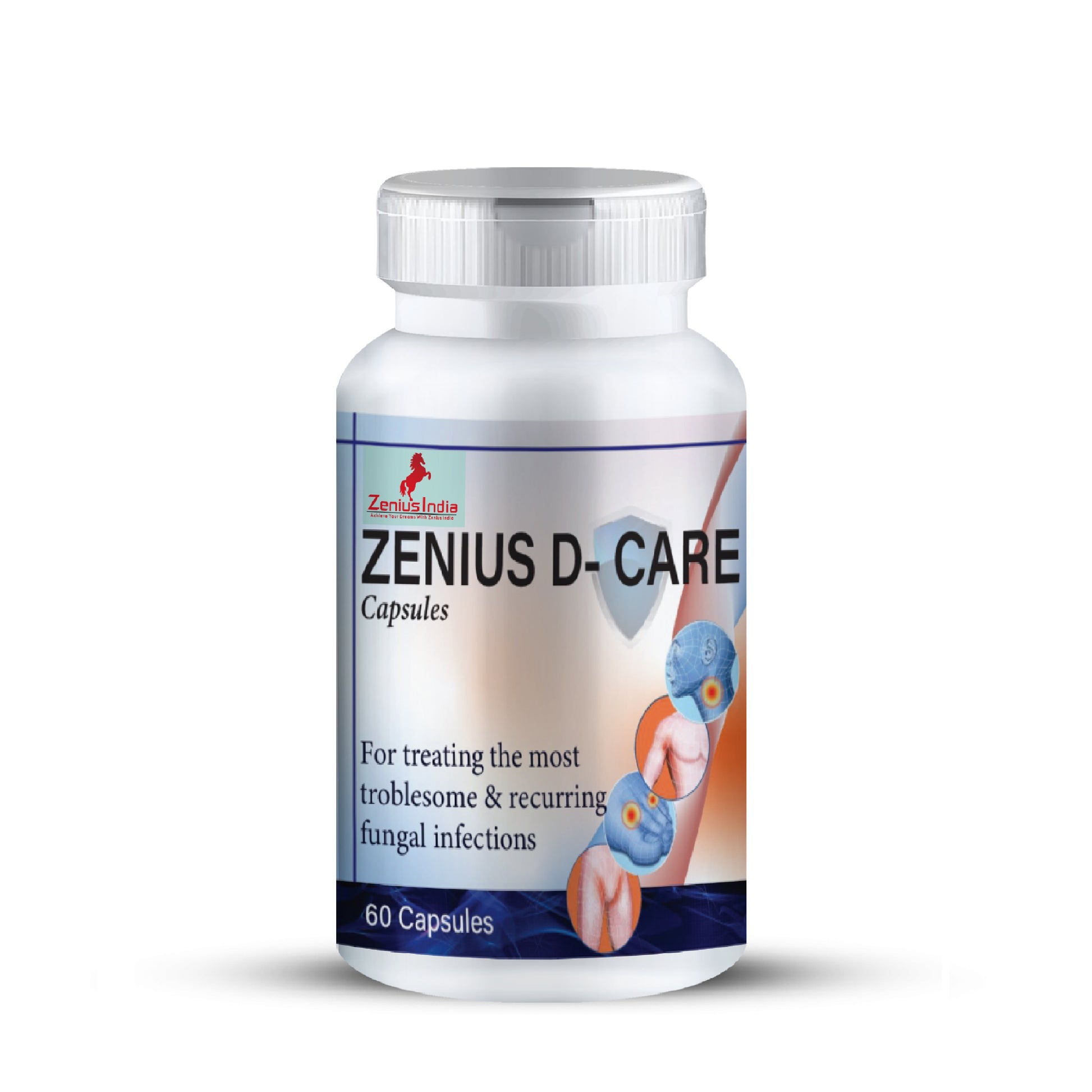 Zenius D-Care Capsule is a type of medication that is used to treat fungal infections. These infections are caused by various types of fungi and can affect different parts of the body such as the skin, nails, and mucous membranes. Fungal infections can be caused by a variety of species of fungi including yeasts and molds. Zenius D-Care Fungal infection capsules are usually taken orally and contains an antifungal agent such as terbinafine, itraconazole, or fluconazole. These agents work by inhibiting the growth of the fungus, preventing it from spreading and eventually killing it.
